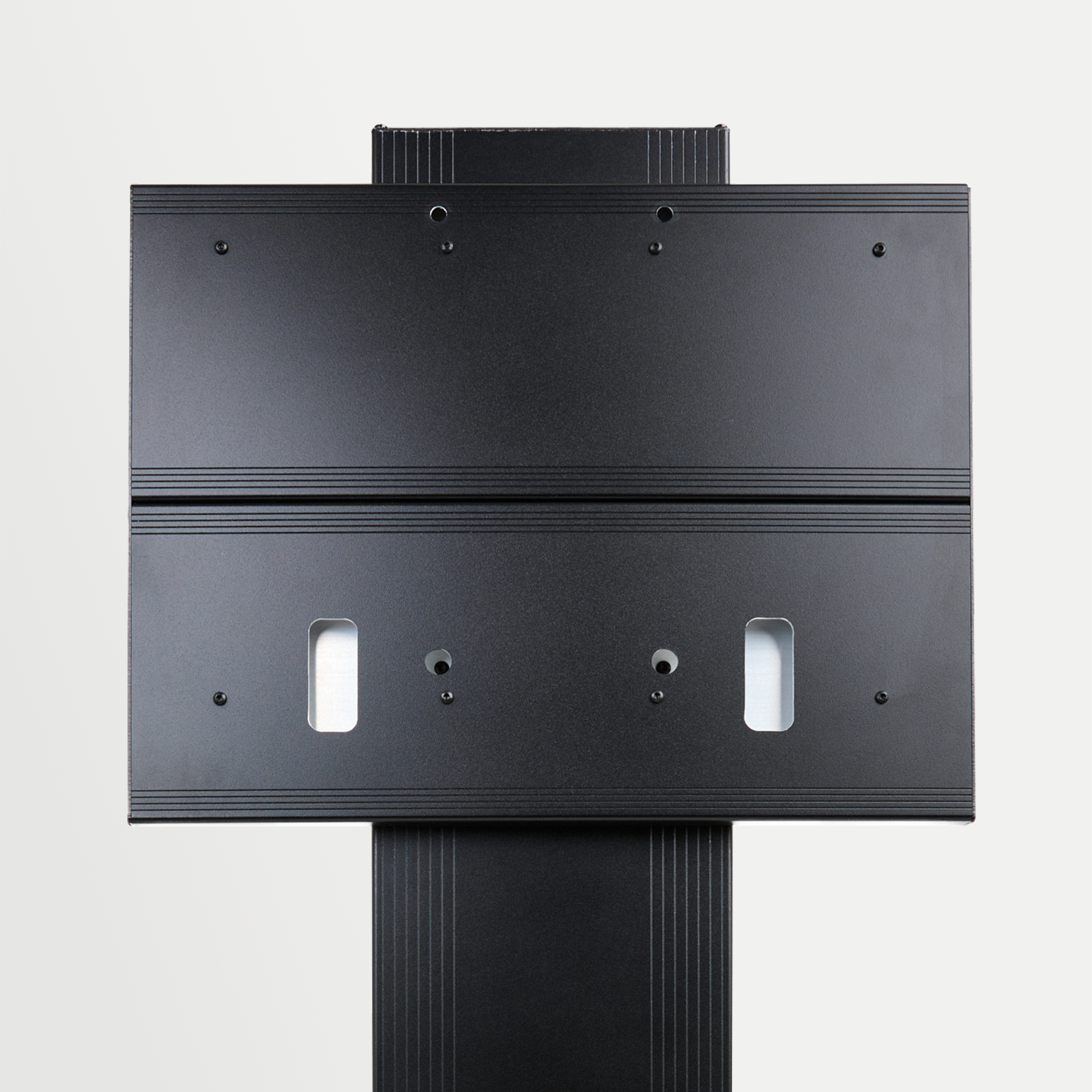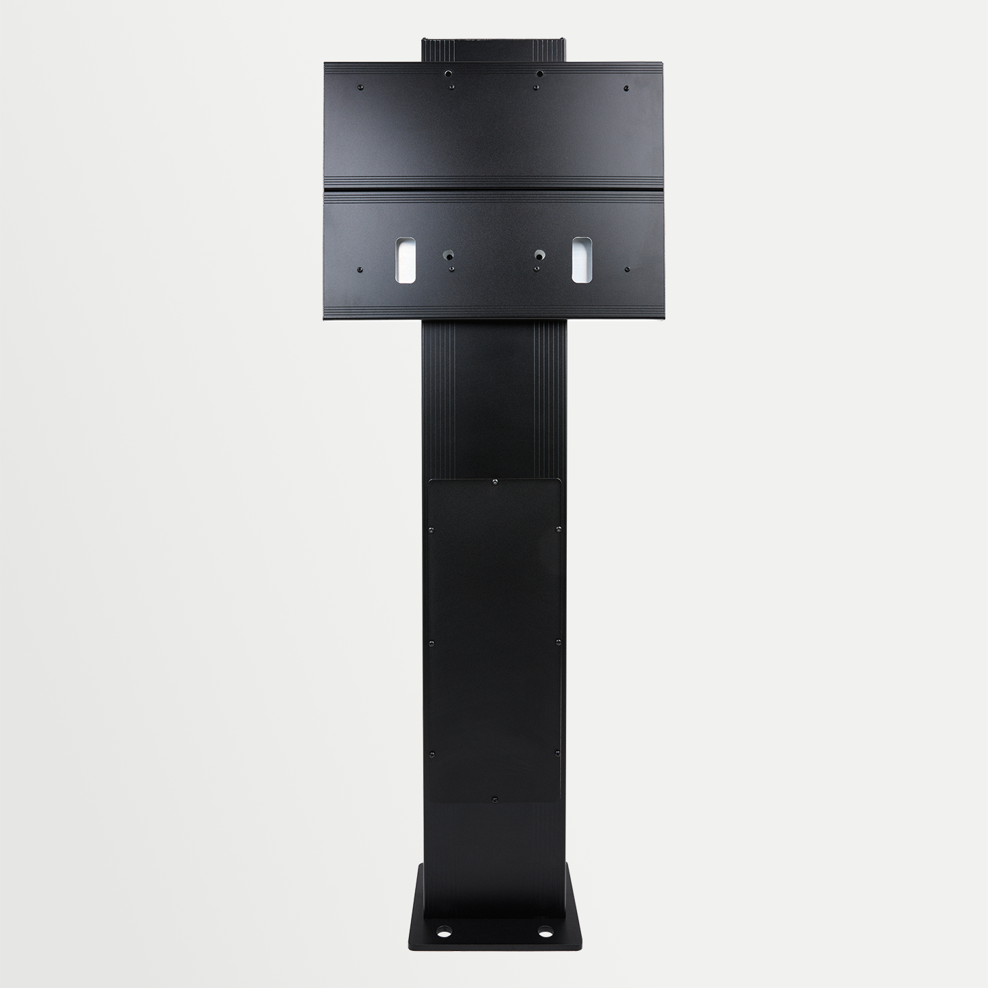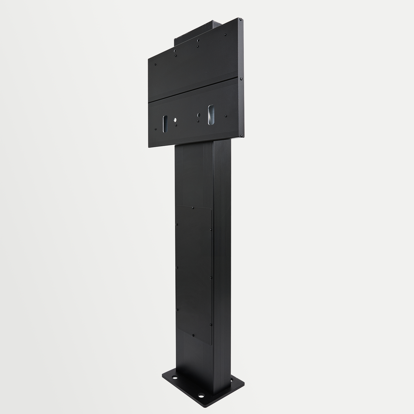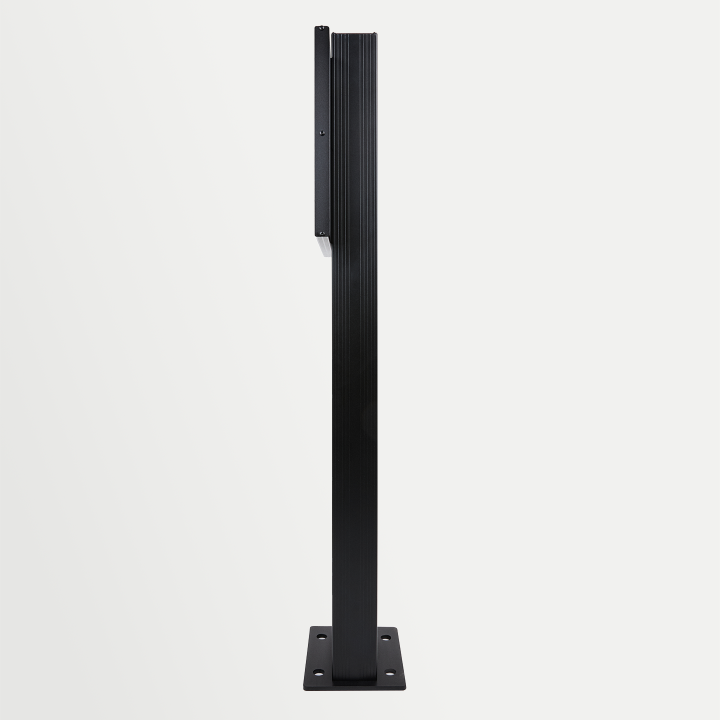 Beslaget har innebygget hulrom for skjult kabelføring, noe som sikrer et ryddig og profesjonelt uttrykk. Konstruksjonen er solid og stabil, utført i aluminium og pulverlakkert i Jet Black (RAL 9005) – Sahara fra Jotun. Overflatebehandlingen er utført i henhold til NS-ISO 12944, klasse C3+, noe som gjør produktet svært godt egnet for bruk i by- og industriområder.